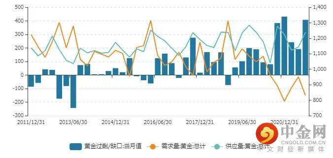 2021年,全球黄金的供需缺口基本呈供大于求的态势。截至9月30日,全球黄金供需为过剩408.16吨。如图2-1所示。