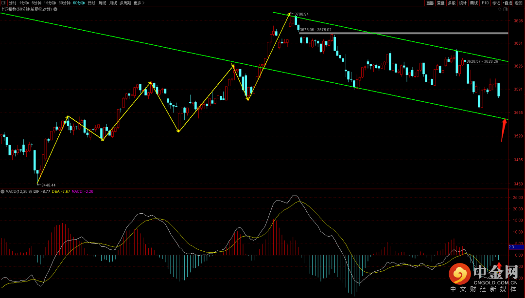 大盘出现六十分钟下跌扩张走势,短期大概率还会有继续向下的走势,关注下降趋势轨道下轨支撑,大概率能出反弹走势,关注反弹力度,在没有突破下降趋势线之前大概率不会有大的反弹空间。