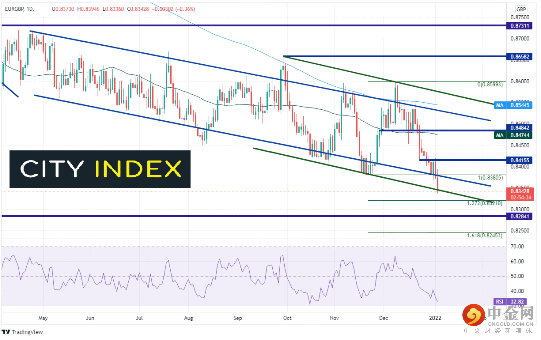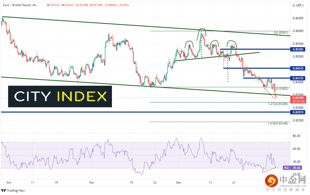 如果真如鲍里斯·约翰逊所预测的那样,奥密克戎变种能够得到遏制,且英国也不会进一步实施限制或封锁措施,英镑应看涨。因此,欧元/英镑可能继续下挫。不过,由于欧盟CPI将于周五发布,加之RSI与汇价走势背离,要留意货币对短线或有反弹。