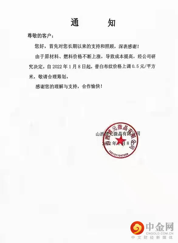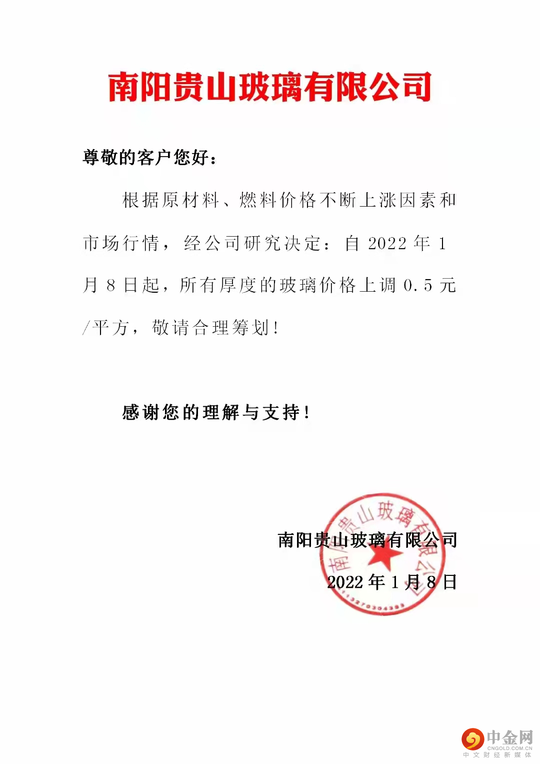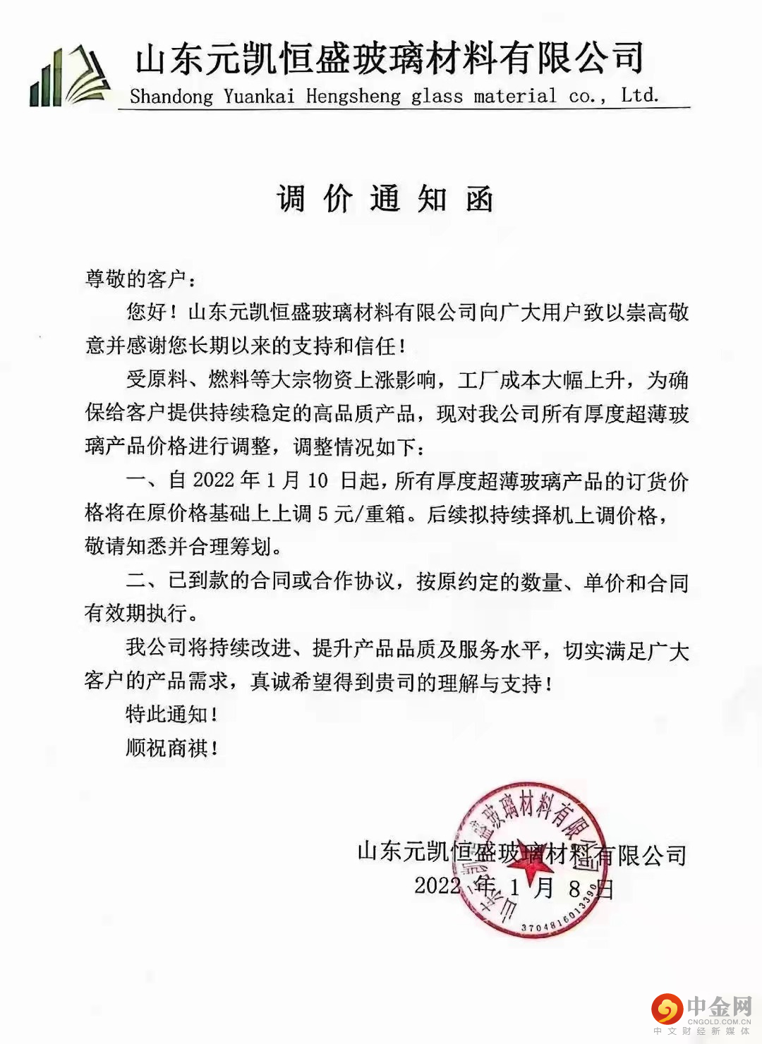 “根据原材料、燃料价格不断上涨因素和市场行情,经公司研究决定:自2022年1月8日起,所有厚度的玻璃价格上调0.5元/平方。”刚刚过去的周末,国内多家玻璃生产加工企业发出涨价函。