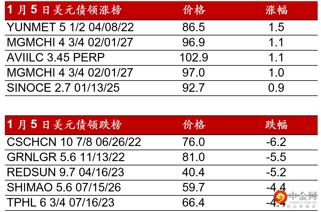 昨日(1月5日),高收益债券市场整体表现较为疲弱,整体偏向避险情绪。地产板块债券如雅居乐/合景泰富/时代中国/龙光等下跌幅度较大,收盘走低3-5pts。龙光在公司发言人澄清已完成债息支付后价格有所反弹。其他地产债券如碧桂园/中骏/融创等受整体市场消极情绪带动小幅走低1-2pts。