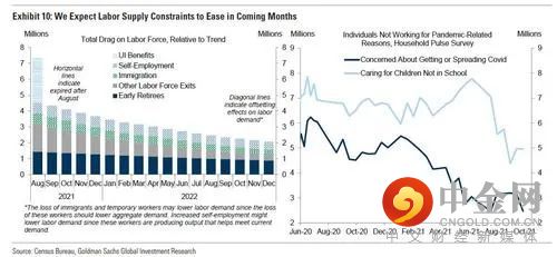劳动力短缺是另一个重要瓶颈,但由于多种原因,预计未来几个月劳动力供应限制将大幅缓解。首先,据高盛经济学家称,9 月份失业保险金到期将推动第四季度就业增长约 100 万。其次,现在学校已经重新开放,由于育儿问题而离职的工人将重返工作岗位。第三,随着疫苗接种的进一步增加和感染率的下降,对病毒的担忧将继续消退——这将鼓励 2-3 百万因健康问题而远离工作场所的人中的一些人重返就业市场。