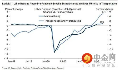 总的来说,高盛预计到 2022 年底总就业人数将增加约 400 万人,对非农就业人数增加 2.7%。如图表 11 所示,这些行业的劳动力需求分别比疫情前的交通运输和制造业水平高 5.1% 和 0.9%。随着工厂和运输工作的职位空缺和工资创下新高,随着这些行业从低薪服务行业吸引工人,这些劳动力短缺应该会逐渐缓解。