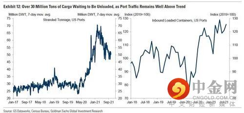 运输延误和港口拥堵也是家具和体育用品等海运消费品的重要瓶颈——半导体和高价值电子产品通常通过空运到达。由于贸易量增加——流入美国港口的集装箱比大流行前水平高 25%(见右图)——以及持续的运输短缺,洛杉矶港的搁浅货物已飙升至历史新高(图 12 的左图)。