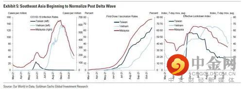 展望未来,乐观的主要驱动因素有几个,首先是疫苗导致的感染率下降(下图、左图和中图)。因此,马来西亚和越南的封锁严重程度现在也接近疫情之前的水平(右图)。