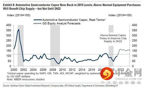高盛分析师追踪到 2021-22 年,供应汽车和消费电子产品的半导体行业的产能每年仅增长 5-10%,并且鉴于半导体用量不断增加,消费者对这些产品的需求也可能在此期间增长,高盛预计芯片供应紧张至少会持续到 2022 年中期。这减少了汽车制造商维持高于正常生产和补充严重枯竭的汽车库存的空间。因此,高盛还预计,到 2022 年中期,汽车经销商的库存将保持在非常低的水平。