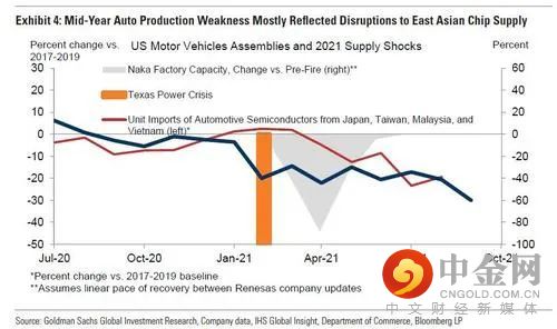 这些发展加上通用汽车和丰田对近期生产的更好评论,第四季度芯片短缺将有所缓解,高盛估计,消除这一供应瓶颈可能会使美国汽车产量恢复到或接近 10-1100 万 SAAR 范围(2020 年末的水平)