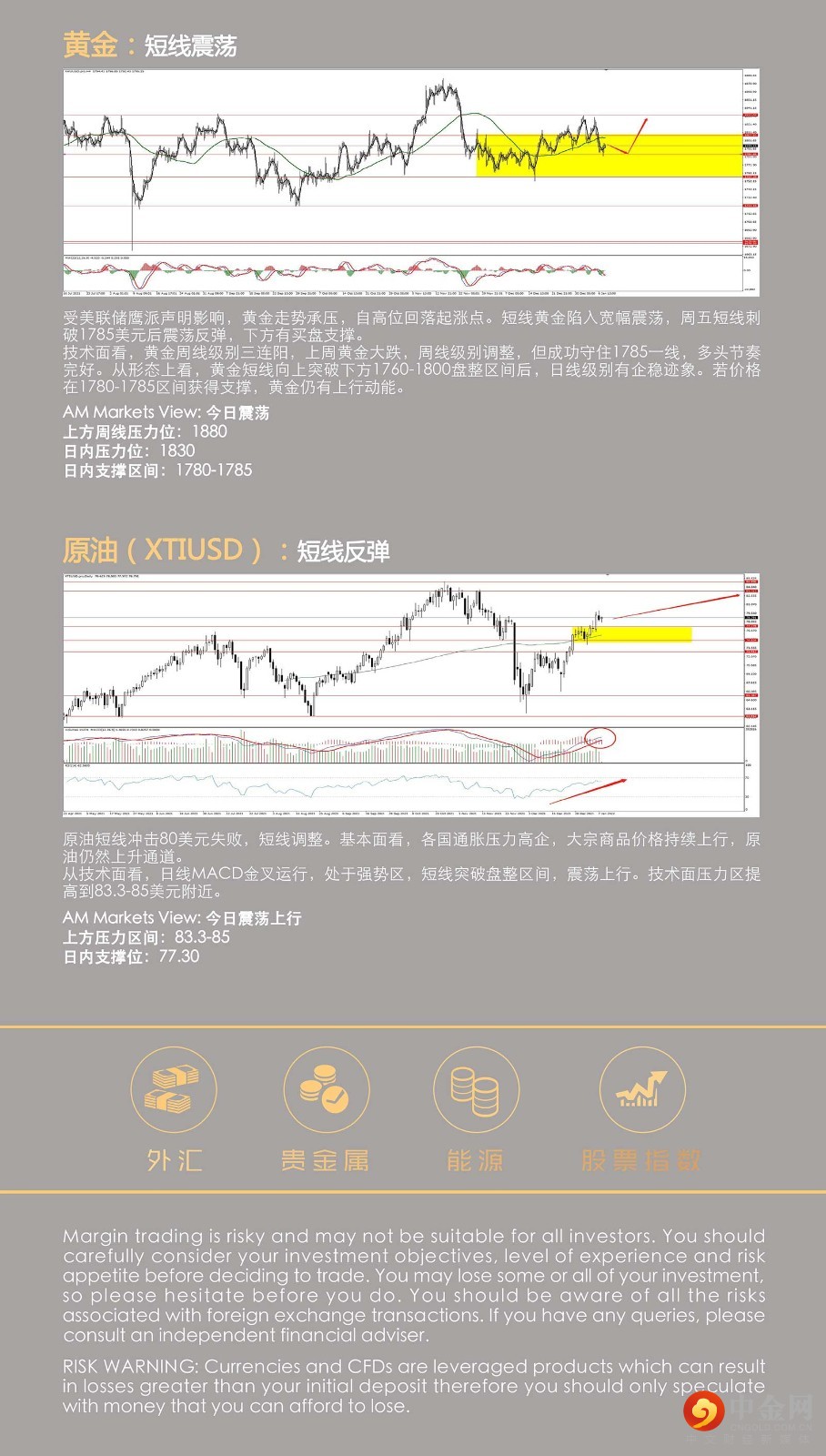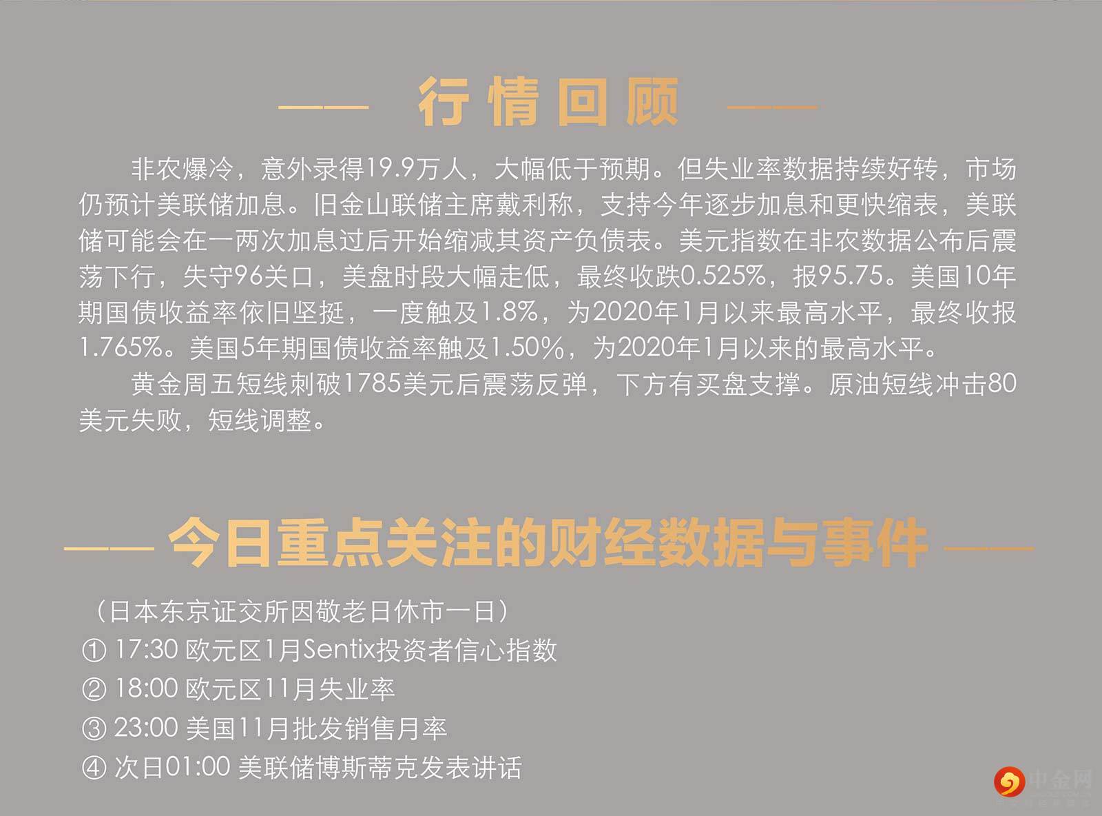 非农爆冷,意外录得19.9万人,大幅低于预期。但失业率数据持续好转,市场仍预计美联储加息。旧金山联储主席戴利称,支持今年逐步加息和更快缩表,美联储可能会在一两次加息过后开始缩减其资产负债表。美元指数在非农数据公布后震荡下行,失守96关口,美盘时段大幅走低,最终收跌0.525%,报95.75。美国10年期国债收益率依旧坚挺,一度触及1.8%,为2020年1月以来最高水平,最终收报1.765%。美国5年期国债收益率触及1.50%,为2020年1月以来的最高水平。 黄金周五短线刺破1785美元后震荡反弹,下方有买盘支撑。原油短线冲击80美元失败,短线调整。