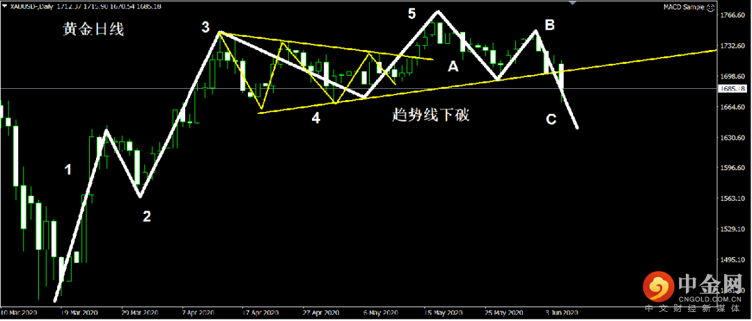 黄金因非农数据大幅度利空,行情下破日线趋势线,MACD放量下行,结合浪形看行情级过5波上涨后见顶下行,行情下破上行趋势线。