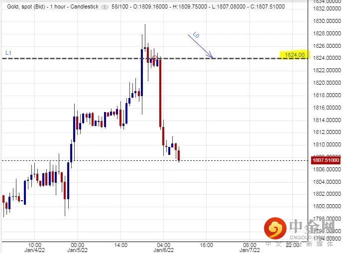 根据联储局发布上次议息会议纪录显示,与会官员们认为不断上升的通胀及劳动力市场紧张化会驱动有更早加息的需要,此外,部分联储局官员认为,当该局开始加息之后很快便开始缩减8.76万亿美元的债券及其他资产组合。在加息必然发生以及后续很快便有缩减资产负债表的情况下,投资者在高位追入黄金的意欲应会备受抑压,故此,短期间金价应该会在$1,824美元附近遇上障碍。