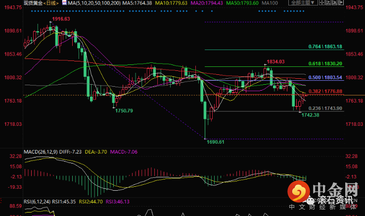 总的来看,金价周二承压于10日均线,且未收于38.2%回撤位上方,显示日内金价有可能继续承压下行。