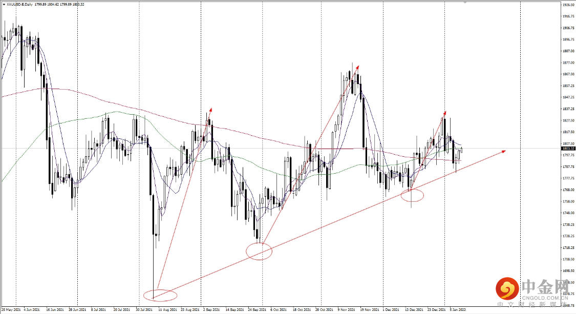 技术方面:从技术面来看,上周五金价从1785美元/盎司附近支撑位反弹,但未能推动金价涨向1800美元/盎司。所以这波的上扬很可能难以维持黄金稳定在1800的上方。