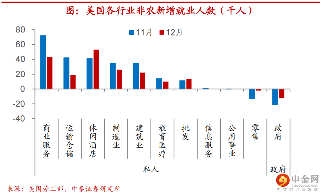 疫情导致服务业就业恢复受阻。12月服务业新增就业15.7万人,较上月减少4.1万。服务业新增非农就业人数下降与疫情的严峻形势密切相关。美国12月新增确诊病例录得544.5万例,相较于11月的242.6万例,涨幅巨大,疫情形势不容乐观。休闲酒店、教育医疗等作为服务业中的高接触性行业,新增就业受疫情形势影响严重。