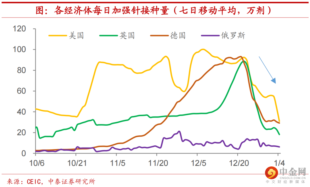 2021年美联储政策取向更偏“鸽派”,对于通胀的快速上升并未及时应对。如果今年美联储继续对于通胀“置之不理”,不仅高企的通胀水平难以显著下降,而且也会影响到较为脆弱的劳动力市场。首先,新冠疫情的阴影短期挥之不去,引发部分就业和通胀压力。在Omicron变异毒株出现之前,由于美国疫苗覆盖率较高,Delta病毒对就业市场的影响趋于消退,但新毒株的出现使得疫苗对未接种加强针人群提供的防护力大幅下降,对劳动力市场的影响不容小觑。加强针的注射能大幅提升现有疫苗对Omicron的防护率。但美国加强针接种率并不算高。美国加强针接种率仅为2成左右,低于多数发达经济体,如英国、德国和法国,分别达到50.4%、39.8%和33.9%的接种比例。并且,美国加强针接种量近期呈现快速下降。自去年10月20日以来,美国每日加强针接种量快速提升,并保持在80万剂每日的水平上。但自12月圣诞假期以来,美国加强针接种量出现断崖式下跌,目前每日接种量约30万剂。