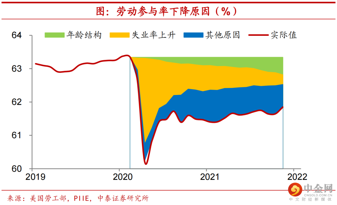 劳动参与率回升仍低。12月劳动参与率继续回升至61.9%,但相比于2020年2月仍下降约1.5个百分点。从劳动参与率低迷的原因来看,首先,人口年龄结构的变化可以解释大约三分之一的下降,即0.5个百分点。由于劳动力在年龄较大时参与率趋于下降,随着人口老龄化,总体劳动力参与率预计也会下降。其次,从历史经验来看,较高的失业率与较低的劳动力参与率有关,因为愿意工作的工人可能会因为工作难找而不再求职,该部分可以解释约五分之一,即0.3个百分点的参与率下降。最后余下的部分大约占到一半左右,即0.7个百分点,这部分可能和疫情对劳动力市场带来的特异性冲击有关。据此来看,疫情后劳动参与率的部分下降或具有永久性特征,劳动参与率很难完全回到疫情之前的状态。