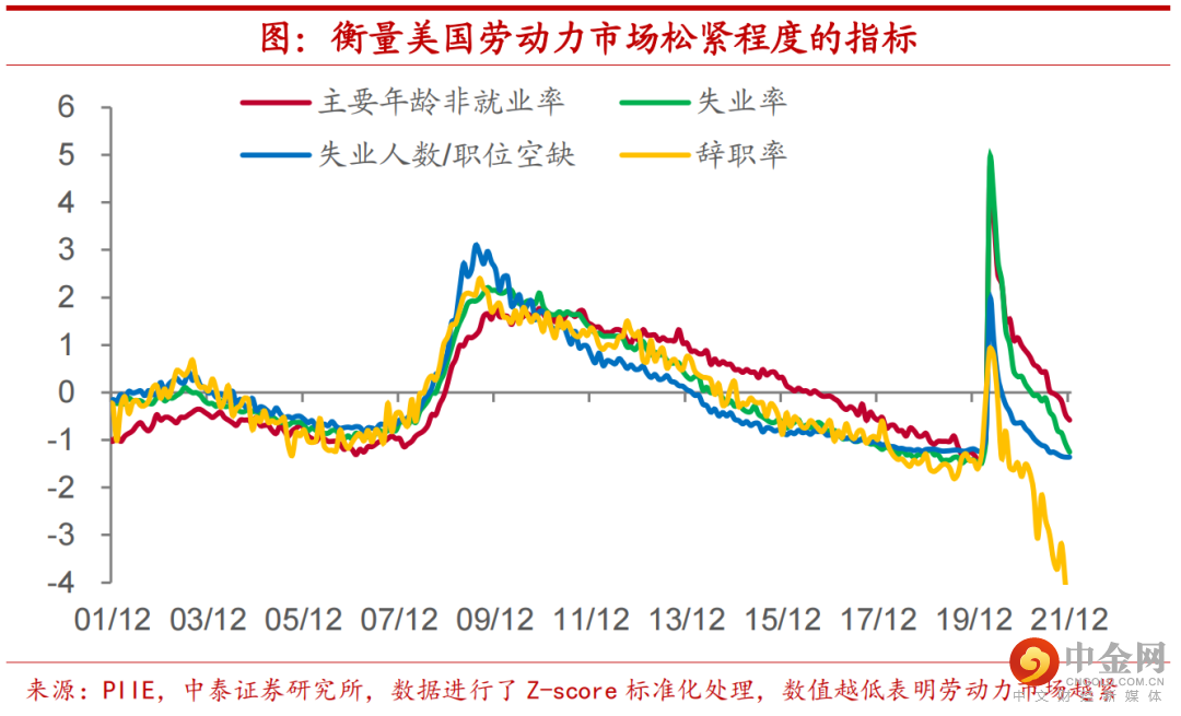 非农就业“大跌眼镜”。2021年12月美国新增非农就业人数录得约20万人,再次打破了11月刚刚创下25万人的最小增幅。12月劳动参与率继续回升至61.9%,但相比于2020年2月仍下降约1.5个百分点。从劳动参与率低迷的原因来看,人口年龄结构的变化可以解释大约三分之一,高企的失业率水平可以解释约五分之一,余下的一半可能和疫情带来的特异性冲击有关。据此来看,劳动参与率很难完全回到疫情之前的状态。失业人数与职位空缺之比以及辞职率这两个指标继续下降,指向劳动力市场依然处于偏紧状态。12月官方失业率继续下降至3.9%,创疫情爆发以来新低,各口径失业率也同步回落。