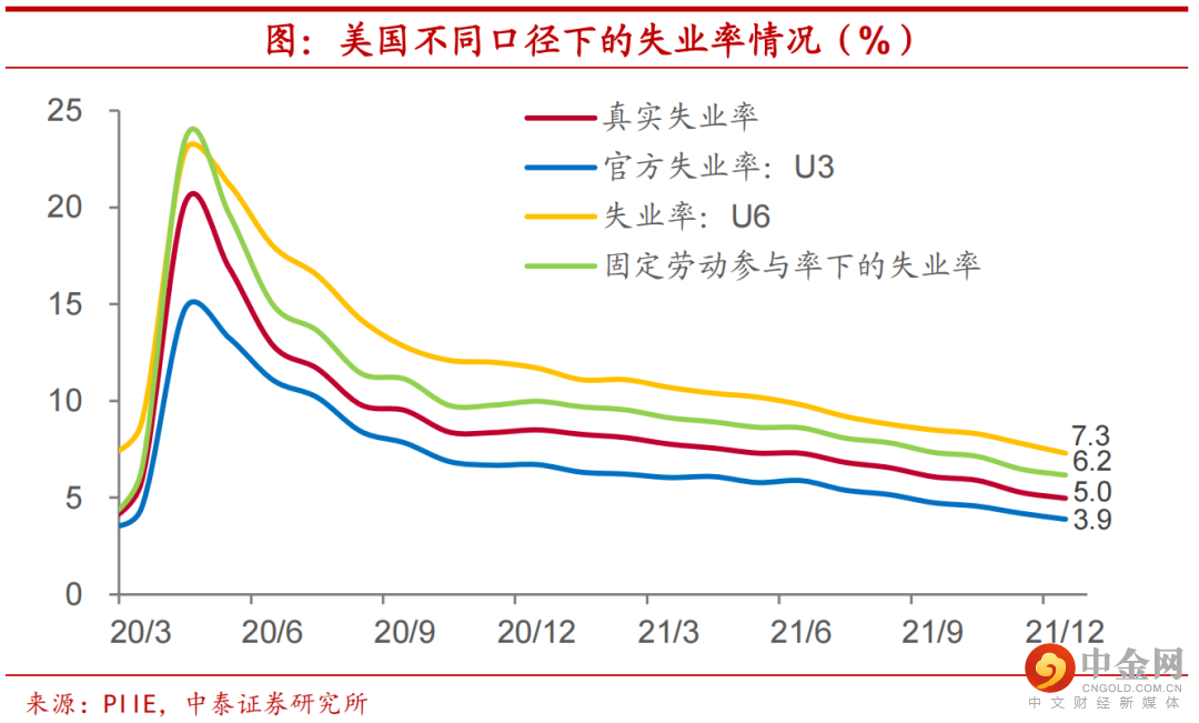 各口径失业率继续下行。12月官方失业率继续下降至3.9%,创疫情爆发以来新低。与此同时,固定劳动参与率下的失业率、真实失业率和U6分别下降0.3、0.3和0.5个百分点,降至6.2%、5.0%和7.3%,各口径下失业率继续保持下降态势,表明就业市场尚在恢复之中。本次非农就业人数与失业率依然出现轻微背离,与上个月数据背离情况较为类似,可能是由于统计口径的不同和抽样误差所致。