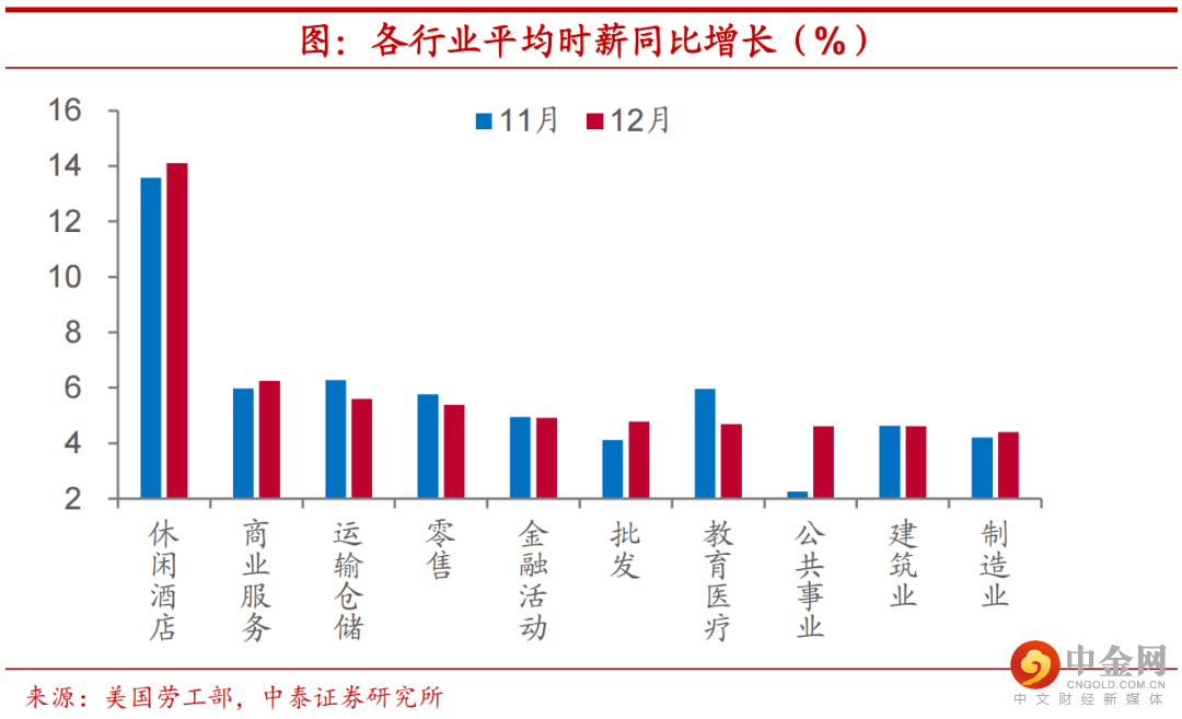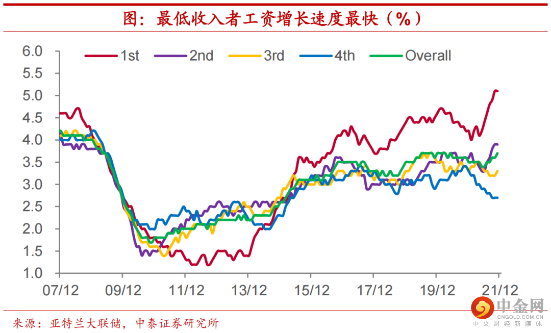 其次,“工资-物价”螺旋初步形成,低收入者要求更高薪资增速。12月非农就业平均时薪同比有所下滑。但环比增速大幅上升,创去年4月以来新高。12月美国私人部门非农就业平均时薪增加了19美分,达到31.31美元,环比增速由0.4%上升至0.6%,同比增速由5.1%下降至4.7%。