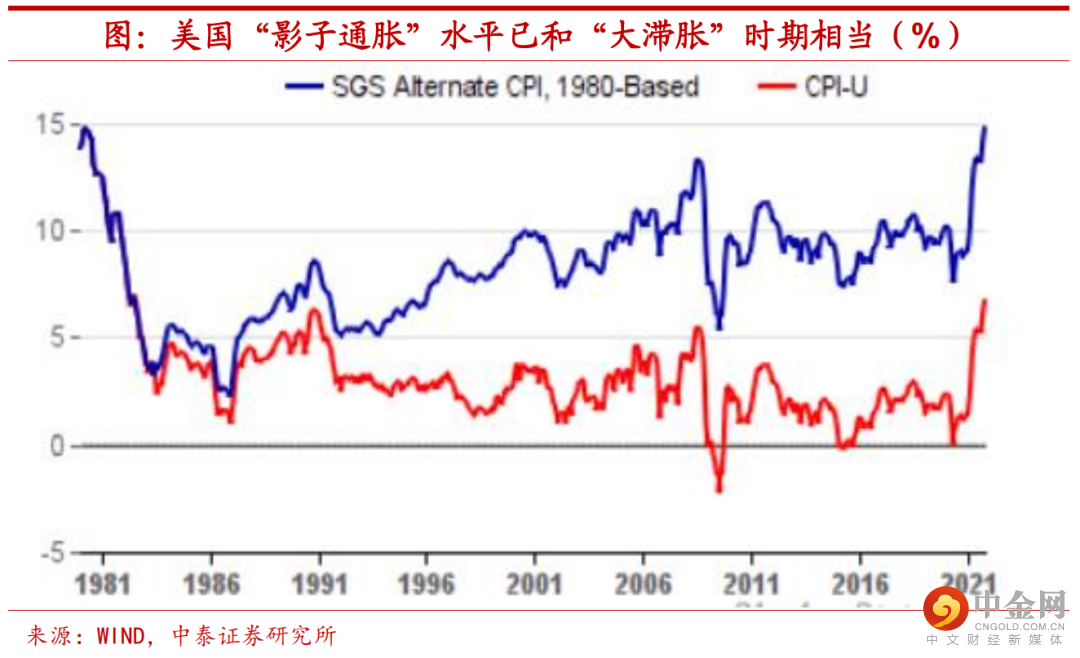 尽管就业呈现出的情况尚不令人乐观,但当前更为困扰美国的还是通胀水平的居高不下。11月美国CPI同比增速已接近7%,但事实上,实际的通胀水平很可能是这一数字的两倍,和“大滞胀”时期已经基本相当。由于对于CPI的统计和计算方法已经发生了较大变化,如果按照1980年的方法,重新计算当前的通胀水平,即所谓“影子通胀”,则会发现美国CPI同比增速已达到15%左右的高位。