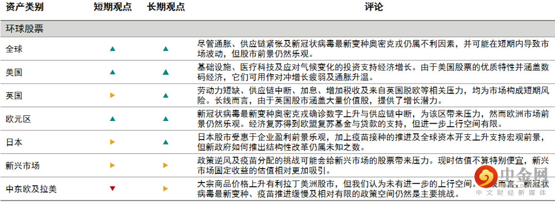 我们对各种资产类别的最新短期(3-6个月)和长期(>12个月)观点