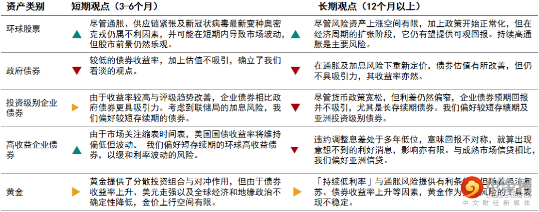 注:短期观点(3-6 个月):用于战术性资产配置时,对相关资产类别相对短期的战术性观点。长期观点(12个月以上):用于战术性资产配置时,对相关资产类别相对长期的战略性观点。