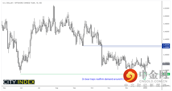 12月8日,美元/离岸人民币汇率收于6.35下方,但次日迅速收复失地,标志空头陷阱。12月31日第二次尝试下穿6.35后迎来尾部买盘,当天收于该关键水平之上。汇价现已走高,我们3.65上方继续看涨并寻求汇价攻向6.42。多头可以等待升穿趋势阻力位/近期高点再行做多。在此之前,货币对仍存在新一轮下跌风险。