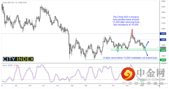 自达成我们初始目标16436后,富时中国A50指数稳步推低。我们在12月注意到反转K线未能收于该关键水平之上,从而最终启动修正行情。虽然指数未能如我们所希望的守住16000上方,但似乎已于15200上方找到支撑,而且一系列前低点及收于该水平之上的锤子线也表明15200上方存在买需。