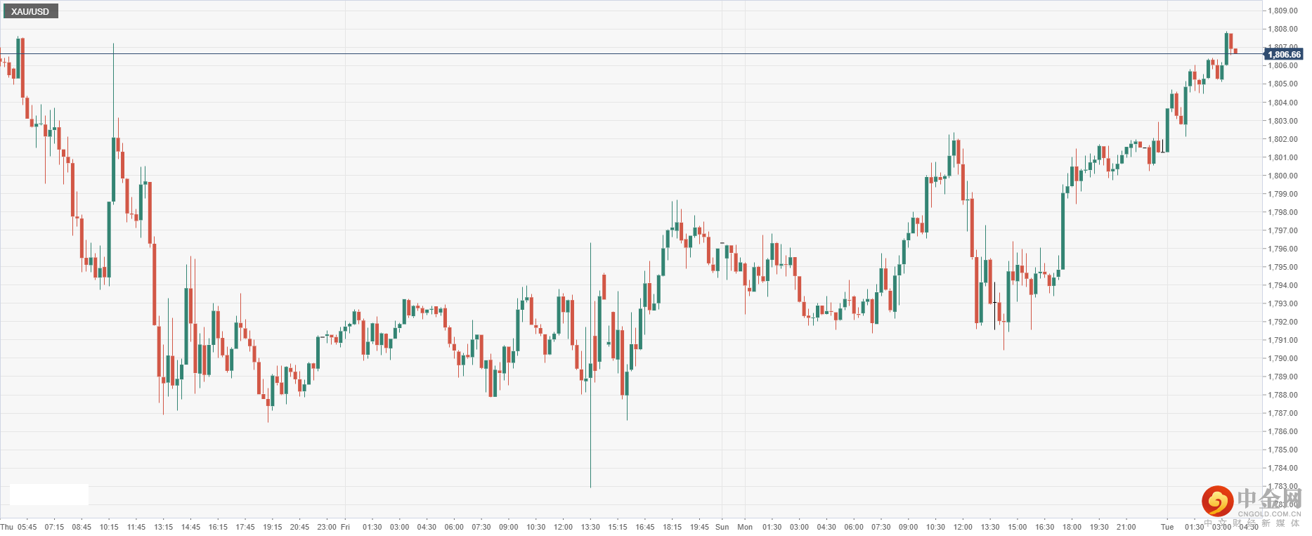 黄金兑美元周一收盘大幅冲高站回千八关口后,今日开盘涨至1806.66水平,得益于美元缩小了美联储鹰派转变后的涨幅,提振金价上行支撑。