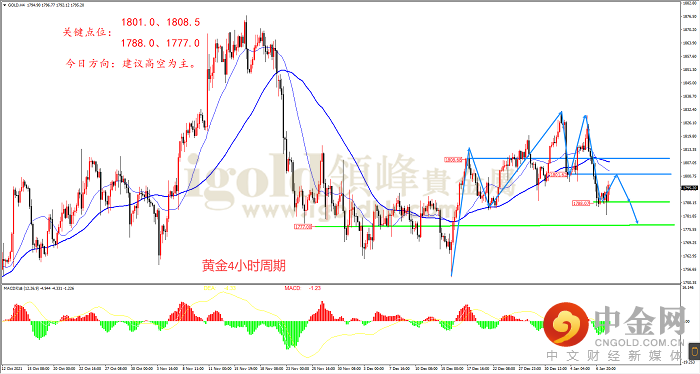 周线级别中,21均线和60均线走平,代表大趋势没有出现,两条均线之间的距离越来越近,代表振幅会越来越小,周线级别处于窄幅震荡走势中。日线级别上看,1月6号出现长阴K线后,截止现在反弹幅度不大,代表空头动能占据上风。4小时周期21均线和60均线已经出现死叉,虽然目前KD金叉,但上涨幅度较小,表明上涨力度比较弱,待反弹至21均线受阻后,可以博取空单。1小时周期中,K线处于21均线和60均线之间,表明方向不明朗。日内建议以4小时为主要方向周期,逢高做空为主,上方阻力位1801.0,1808.5,可以在阻力位附近尝试做空。