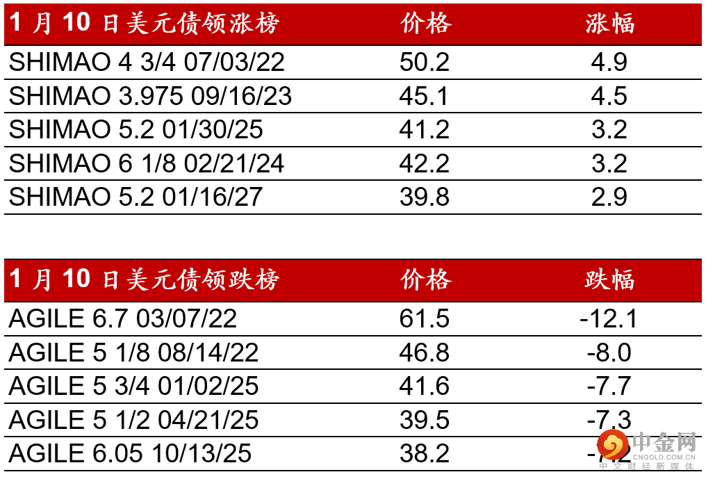 昨日(1月10日),高收益地产板块依旧延续疲弱情绪,雅居乐受关联公司景业名邦公告交换要约和资产处置的消息影响,债券价格大跌8-13pts。其他债券如绿城/融创/正荣/碧桂园等亦受波及下探1-3pts。较高现金价格的地产债券如时代中国和宝龙价格承压较大。在媒体报道央行要求九家国企通过收并购项目资产的方式为中高风险公司提供流动性支持后,世茂债券反弹2-4pts。工业板块债券出现涨跌不一,复星国际债券出现少量买入需求,但西部水泥则有所下跌。