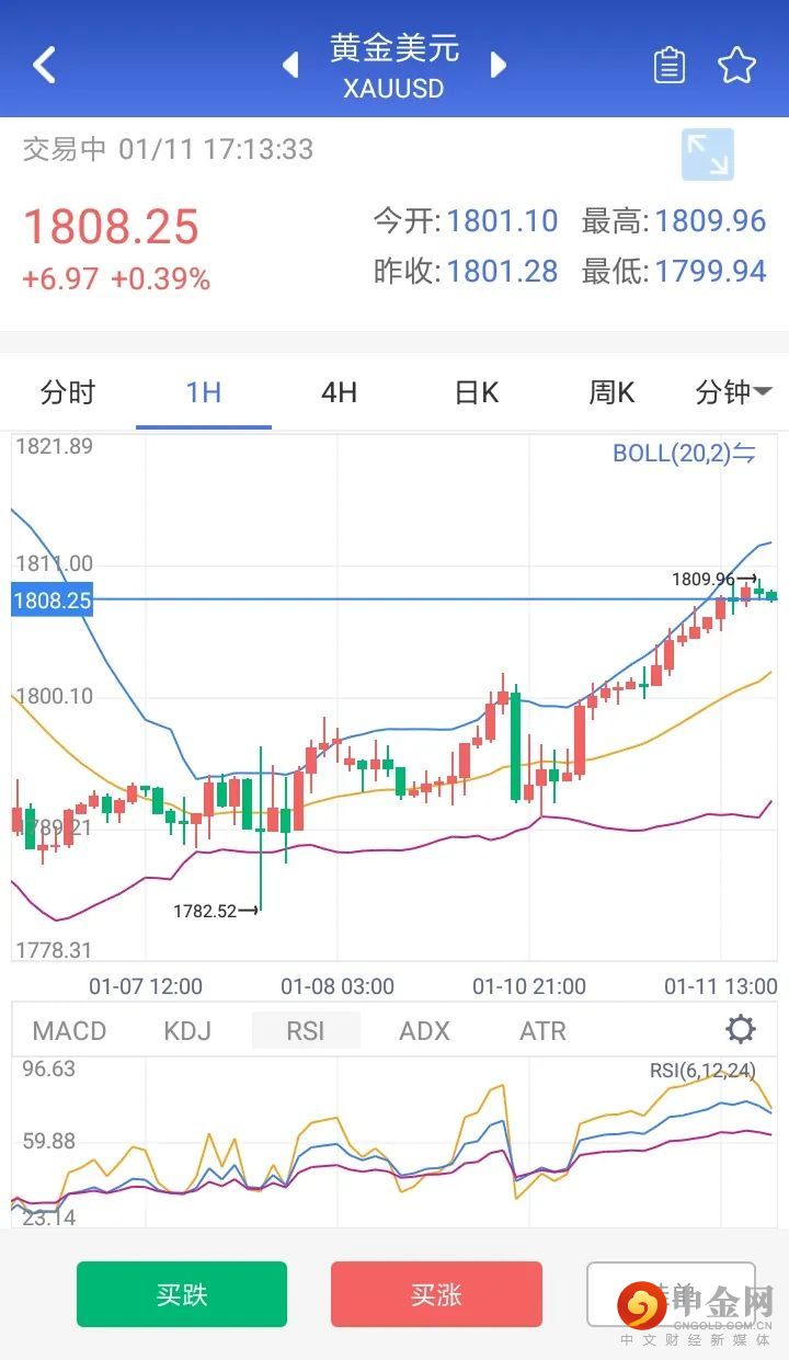在美元上涨动力减弱之后,现货黄金获得喘息之机昨日小幅反弹。本交易日亚盘延续上涨趋势,暂回到1805美元附近。从1小时走势图来看,红色动能柱延续,但力量微弱,金价目前上涨空间有限。有分析指出,金价若在1805之上站稳并突破1808美元,才有进一步向上的空间。