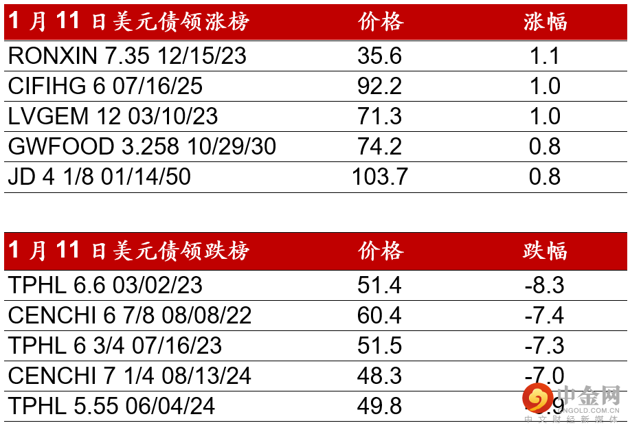 昨日(1月11日),高收益地产板块开盘交投相对平稳,整体不变或小幅回升0.5pt,但午前市场情绪开始走弱,见到基金客户较大量的地产债券卖盘,时代受抛售影响,整体下跌4-5pts,建业亦下跌3-4pts,合景泰富/碧桂园/绿地下跌1-2pts。世茂/雅居乐/中骏/宝龙等昨日价格走势则相对平稳。在工业板块方面,广汇汽车/西部水泥等债券出现少量卖盘,价格小幅下跌。