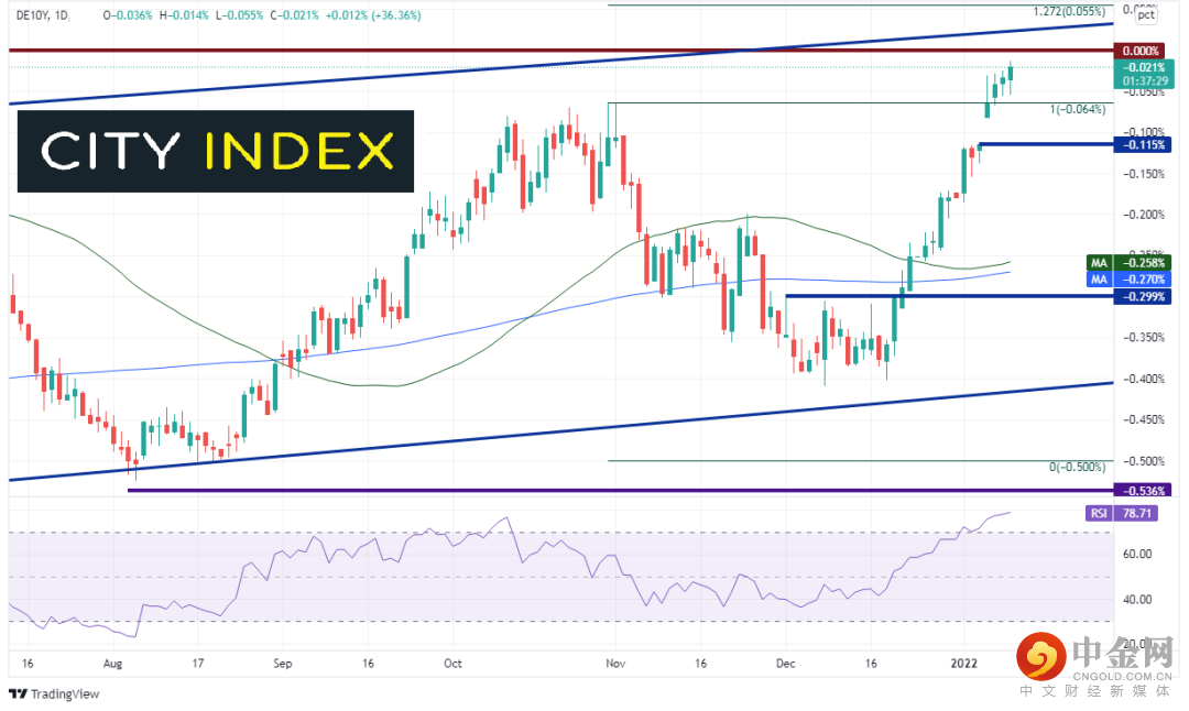 自从2020年11月4日在-0.67%形成低点以来,德国公债收益率的低点和高点不断上抬,构筑上行通道。如果可以上穿0.00%,有望上看由上行通道上轨趋势线、2021年11月1日高点到2021年12月8日低点行情的127.2%扩展位组成的阻力带,即0.03%附近,接着上看2019年4月以来水平阻力位0.102%和前述行情的161.8%扩展位0.149%一线。但请注意,RSI目前报在78.71,处于超买区域,表明收益率或准备回撤。支撑位在11月1日高点-0.064%、1月5日以来跳空填补缺口-0.115%,以及由50天均线、200天均线和前高点组成的支撑带,即-0.299% 到 -0.258%区间。