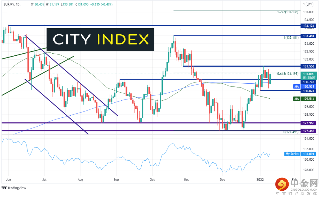 就在德国公债12月初筑底时,欧元/日元也在127.47附近筑底。但12月20日以来,欧元/日元有6个交易日下跌,相比之下德国公债下跌的交易日天数只有2天。欧元/日元从2021年12月20日的127.52上涨至2022年1月5日的131.60,在这13天里斩获超过400点子的涨幅。该货币对止步于由前低点、2021年10月20日高点到12月3日低点行情的61.8%回档位和200天均线组成的阻力带,即130.53-131.55区间。