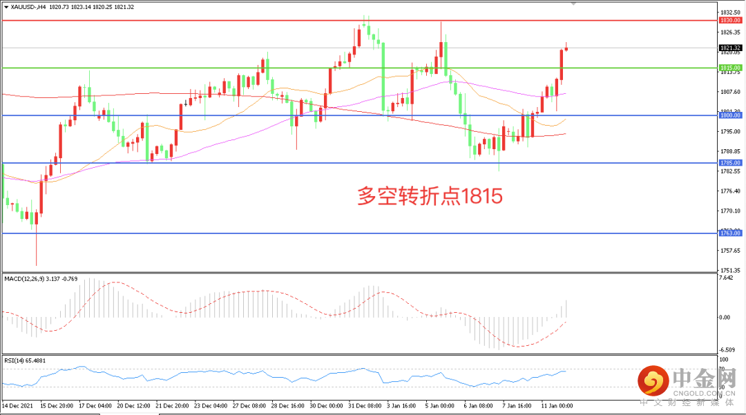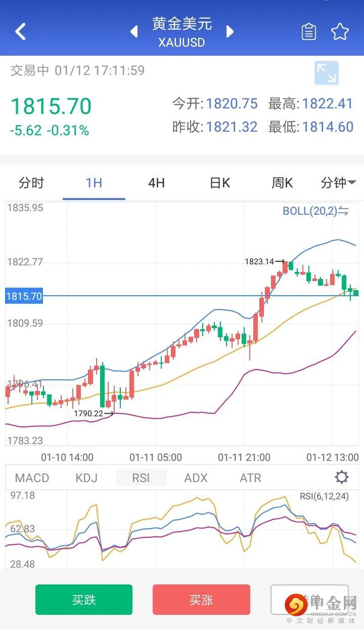 周二,在美元走弱之际,现货黄金震荡走高,美盘中站上1820美元/盎司,为1月5日以来首次,较日低涨逾20美元,最终收涨1.12%,报1821.32美元/盎司。本交易日亚盘,现货黄金小幅回调,但距离上个交易日创下的高位1823美元不远。从1小时走势图来看,红色动能柱缩短至消失,多头动能耗尽。目前投资者在等待晚间美国通胀数据。