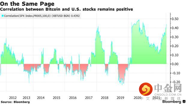 目前,比特币与标普500指数的100天相关系数为0.44,这是自2020年第四季度以来的最高水平,也是十年前的最高水平之一。(系数为1表示资产走势一致,为-1则表示资产走势相反。)