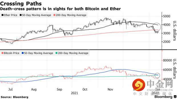 2022年至今,比特币仅有三个交易日是上涨的。尽管第二大加密货币以太坊在周二上涨至3233美元/枚左右,但其似乎也将形成“死亡交叉”。
