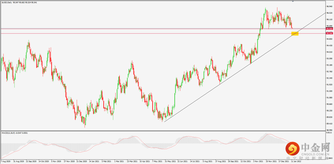 美元指数DXY收盘下跌0.37%,创1月以来新低,现报95.54;现货黄金XAUUSD隔夜上扬20美金,截至发稿现报1817.9。