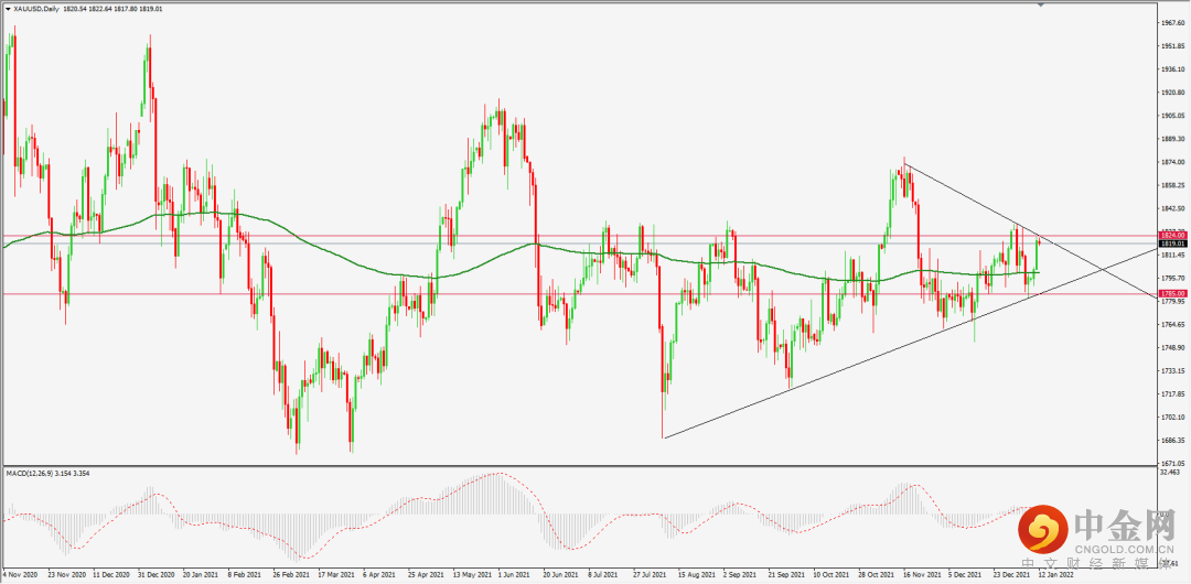 天图盘面上看,虽然隔夜强势上扬20美金使得200EMA被明显上破,这暗示市场情绪偏向看涨,但自11月7日以来的下降阻力线延伸处即1824给多头带来挑战。指标方面,MACD上行动能恢复不多,因此截至发稿今日金价依旧受限。虽然技术面指引市场看涨情绪有回归的倾向,但在晚间关键CPI数据公布之际,基本面可能将带来更多影响,持仓投资者请注意风险管控。