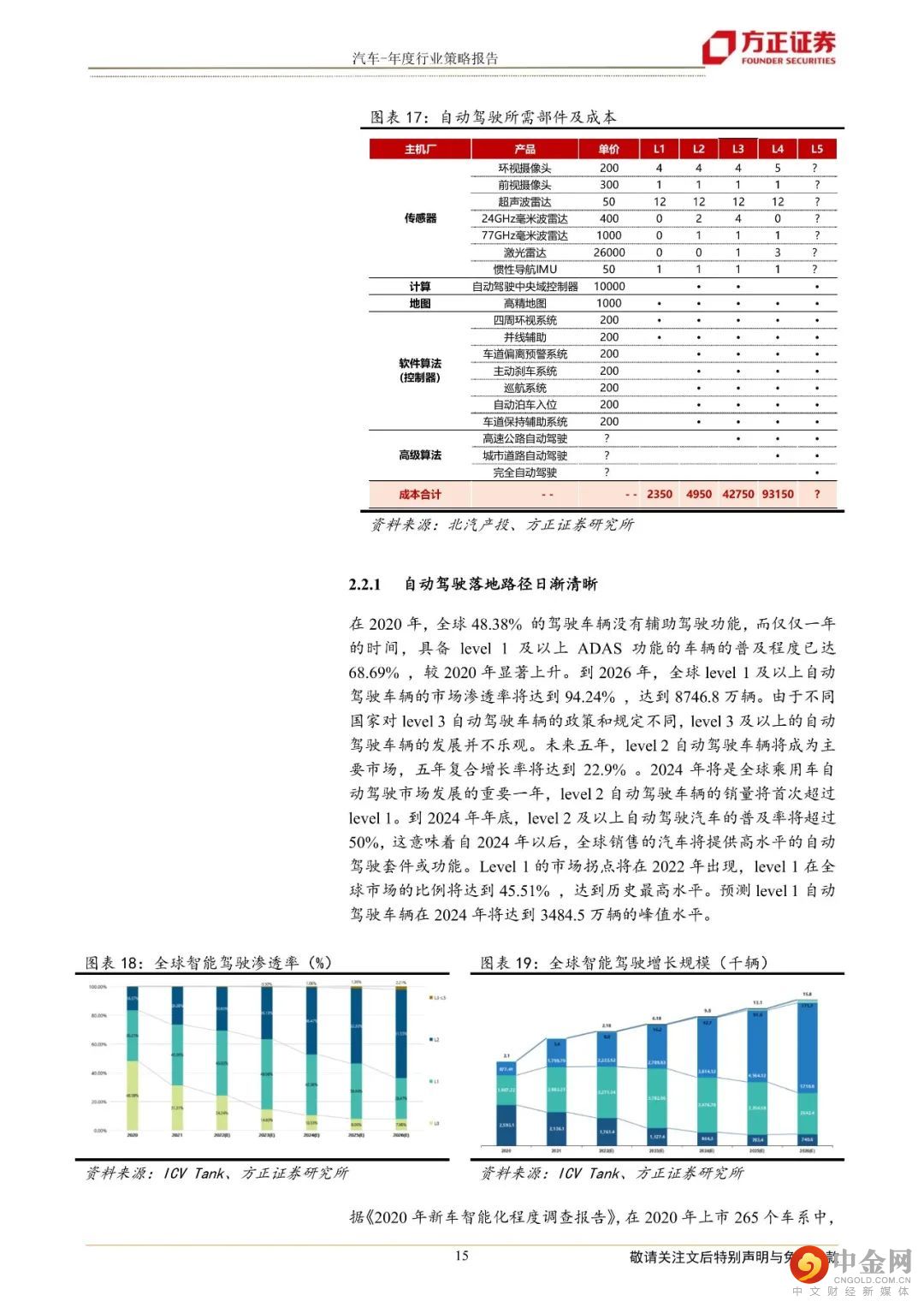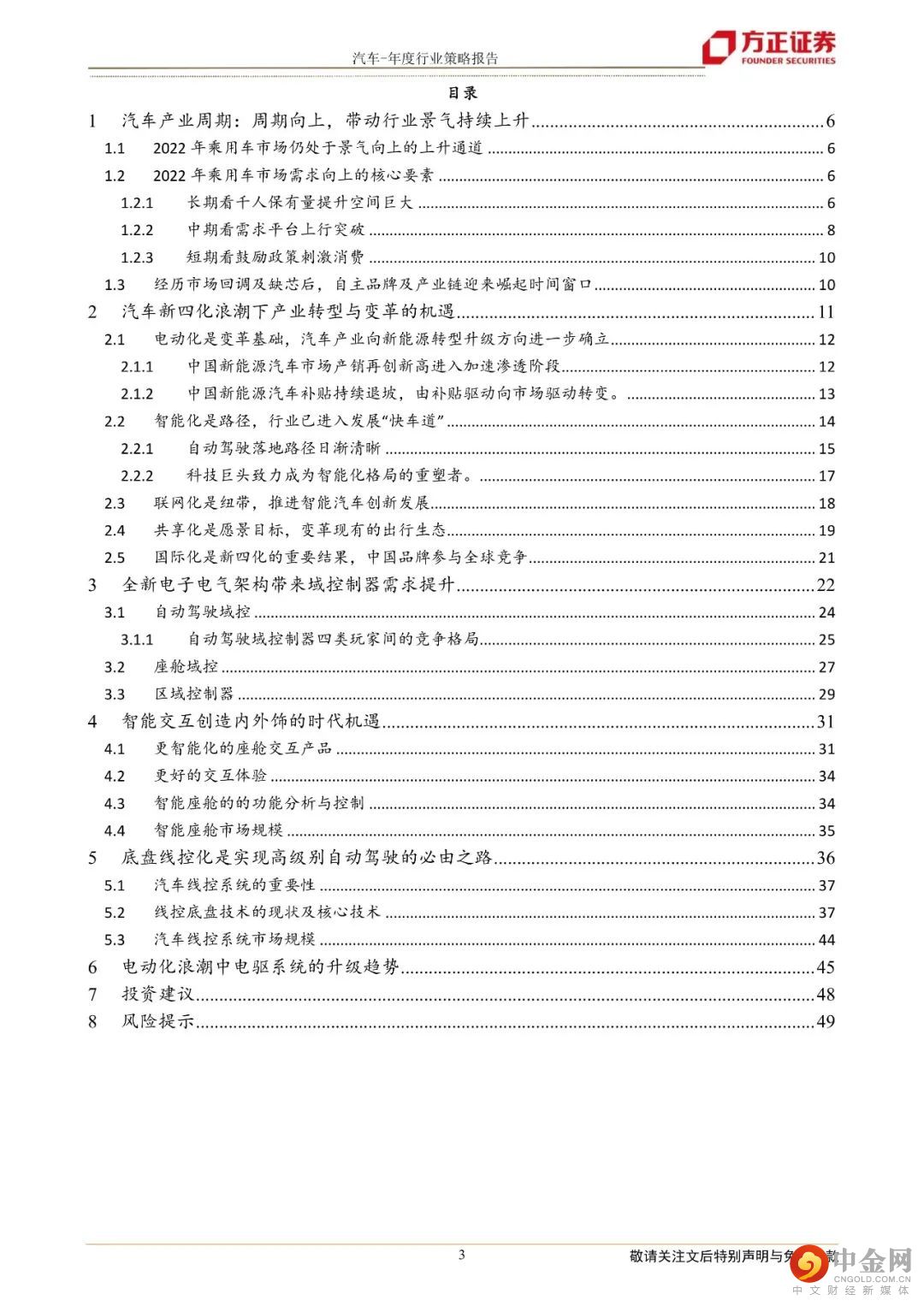 中国汽车产业仍处于景气向上周期,将带动需求总量持续上升。 长期看,千人保有量尚有巨大的提升空间,将带动整车需求的高速增长;中期看,我国汽车需求平台期内销量下行阶段在2020年结束,2021年将进入此次平台期的上行阶段,2022年将迎来平台期的突破。短期看,缺芯问题开始逐步缓解,需求“堰塞湖”有望得到解决。域控制器方面,主流主机厂的下一代电子电气架构将在未来1~2年推出,消费者对于自动驾驶和智能座舱以及功能不断选代的需求推动域控制器渗透率提升。2025年全球汽车域控制器(座舱+自动驾驶)出货量将超过1400万套,预计市场空间345亿元,预计未来年复合增长率在50%。智能座舱方面,智能座舱场景所需要的主要功能不断增加,包括语音指令的位置识别功能、车内摄像头人脸识别功能、车内主动降噪功能、头枕音响的独立声场、座椅旋转功能、智能调光玻璃功能、多功能中控台等。在需求升级的带动下,中国2026年智能座舱市场规模可达183亿美元,2020~2026复合年增长率为14.2%。线控底盘方面,底盘线控化是实现高级别自动驾驶的必由之路。汽车底盘系统约占整车成本的10%左右,线控底盘细分市场与驾驶自动化程度高度相关。预计国内乘用车线控底盘核心系统市场规模2020/2025年达到175/600亿元。5年CAGR为27.94%。电驱系统方面,由于电驱动系统在新能源汽车产业链的关键地位,并直接影响新能源汽车行驶性能等诸多参数,其主要构成部分为驱动电机总成、控制器总成、传动总成。2025年新能源汽车销量渗透率达到20%,销售量突破600万辆,新能源电驱动力总成的市场规模将快速增长,2025年动力总成市场规模将达480亿元,未来5年复合增长率为34%以上。投资建议:汽车整车建议关注上汽集团、长城汽车、广汽集团、小康股份、江淮汽车等以及流通渠道环节的广汇汽车等;域控制器领域建议关注德赛西威、均胜电子、中科创达、经纬恒润等;智能座舱建议关注德赛西威、均胜电子、华阳集团、上声电子、科大讯飞、沪电股份、宁波华翔等;线控底盘领域建议关注伯特利、拓普集团、中鼎股份等;电驱系统方面建议关注汇川技术、英博尔、精进电动、大洋电机、万安科技、亚太股份风险提示:疫情影响超预期导致宏观经济疲软持续下行;全球供应链危机持续,导致主机厂开工率严重不足;汽车市场需求疲软不及预期。