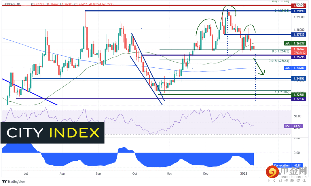 美元/加元如果下破颈线所在的1.2600,则目标在1.2240附近。但在通往该目标的路上还有不少“拦路虎”,首先就是2021年10月21日低点到2021年12月20日高点行情的61.8%回档位,即1.2566,然后是200天均线1.2500和水平支撑位1.2415。如果守住1.2600,上看50天均线所在的1.2693、水平支撑位1.2764和2021年12月20日高点1.2950。