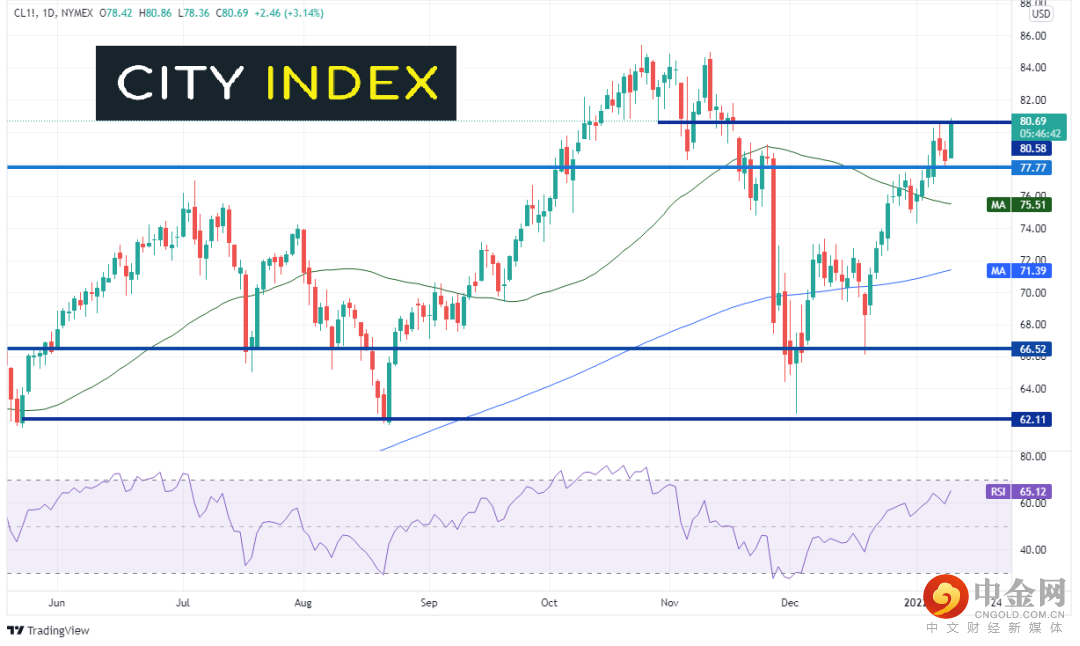 提醒读者,此文发稿时西得州原油期货交投于80.58阻力位。