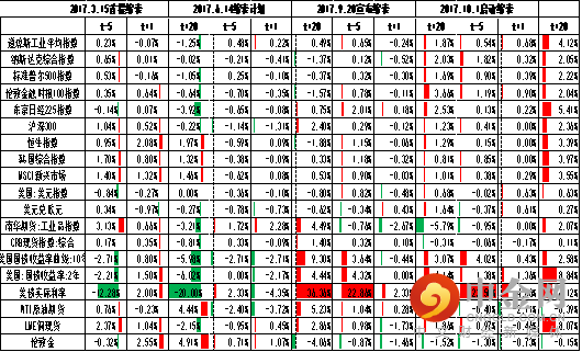 我们进一步再将目光聚焦短期冲击。从各关键时点的短期表现来看,其实在2017年3月首提缩表后的一个月内,我们可以看到无论美股还是欧股都出现了不同程度的回调,美股三大股指中科技股回调幅度反而最为温和,新兴市场股市除沪深300外,其余的都出现了不同程度的上涨,说明首提缩表并没有对新兴市场股市带来多大的冲击。