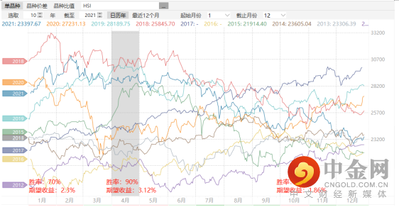 根据对历年的十年数据统计,我们发现恒指具有明显的季节性特征:1月、4月和10月的指数表现大概率优于其他月份。恒指1月份的胜率高达70%,期望收益2.3%;4月份的胜率高达90%,期望收益3.12%;10月份的胜率高达80%,期望收益1.86%。