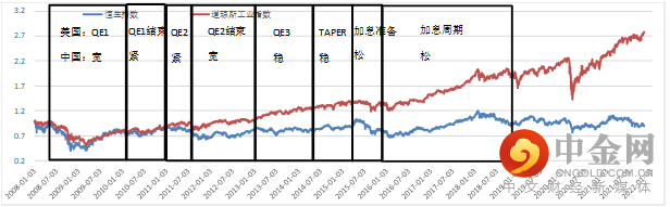 对标上一轮的周期, 2013年底减量、2014年底减量结束、2015年底首次加息、2016年再次开启加息、2017年底缩表,期间美股市场在2015年811汇改、2015年底首次加息出现了两次相对较大的波动。其实仔细看的话,不论是美债利率的走势还是当时首次加息后股市出现波动,都是由于基本面(美国和中国)都相对偏弱。但待美国和全球增长再度上行后,2017年开始持续加息到2017年底缩表,整体市场都依然呈上行态势,直到2018年初和2018年末加息到尾声,基本面彻底逆转后,美股市场最终逆转。