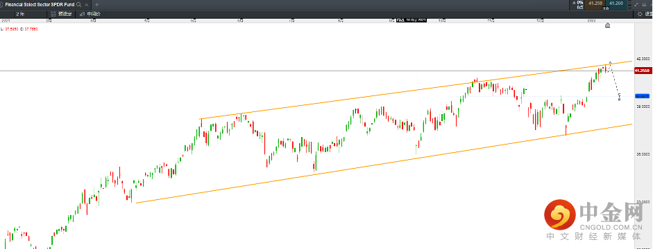 美国金融精选行业SPDR基金(XLF)近日一直维持震荡上行的节奏,但从技术层面来看,已经到达了上行通道的上轨压力处,近两个交易日均以收阴告终。因此,投资者需要防止业绩发布后的利好兑现现象,此处回落的概率较高。投资者可参考下方的支撑39.6附近,如若跌破,价格可参考下轨支撑38附近。