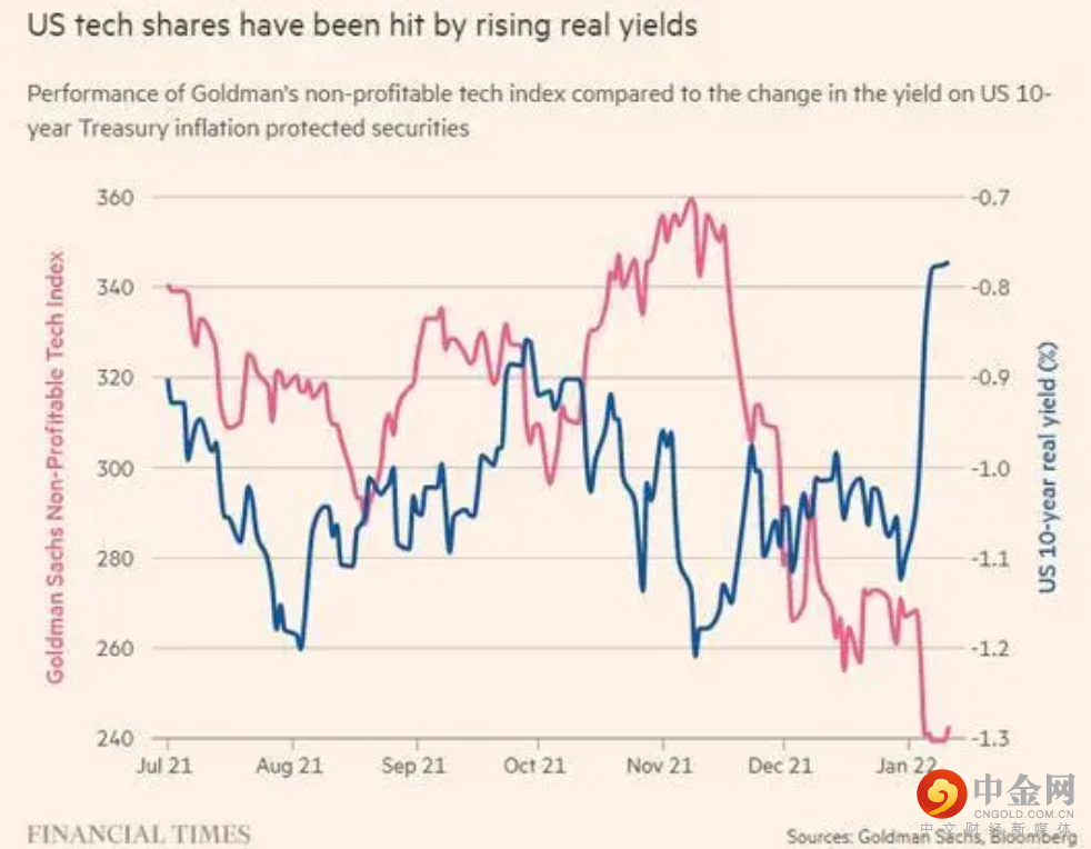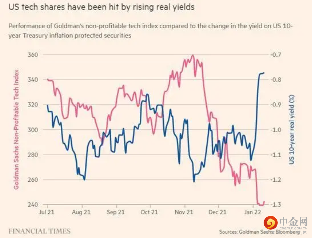 美债实际利率的大幅上升在2022年震动了美股市场,并导致高涨的科技股回落。