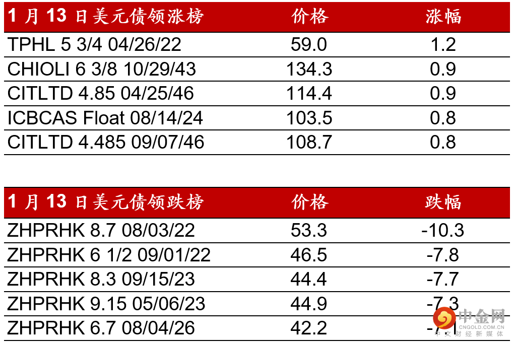 昨日(1月13日),高收益地产板块整体继续走弱。在IFR报道称碧桂园3亿美元潜在可转债因未能吸引足够投资者需求而未推进后,碧桂园股票和债券因市场投资者抛售出现双线下跌,但今早公司否认相关消息。此外,正荣地产债继续走低,22年至26年到期债券价格跌至40-50美元水平。在标普应世茂集团要求撤销其“B-”长期发行人评级与“CCC+”发行评级后,世茂债券整体大幅下跌。仁恒置地/绿城中国等债券也受市场抛售影响,下跌1-2pts。其他债券如融创/旭辉/龙光/合景泰富等亦下跌2-4pts。工业板块,澳门博彩债券在执照更新前的不确定因素加上疫情影响整体情绪走弱,澳门博彩下跌2-3pts。