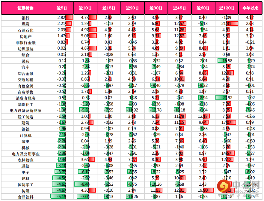 通过对行业周期涨跌幅的观察,我们可以找到短期内表现较好的行业,如银行、煤炭、石油化工、房地产,这些行业近5日、近10日的涨幅有一定的持续性,是近期的热门行业。