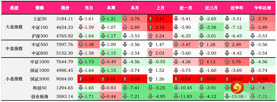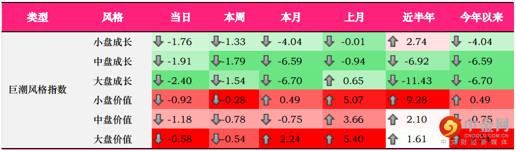 巨潮风格方面,各风格均收跌;但从相对涨跌幅角度来看,价值风格相对涨跌幅优于成长;大、小盘风格上未有明显优势可言。